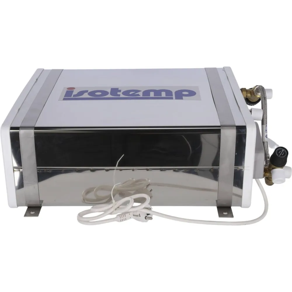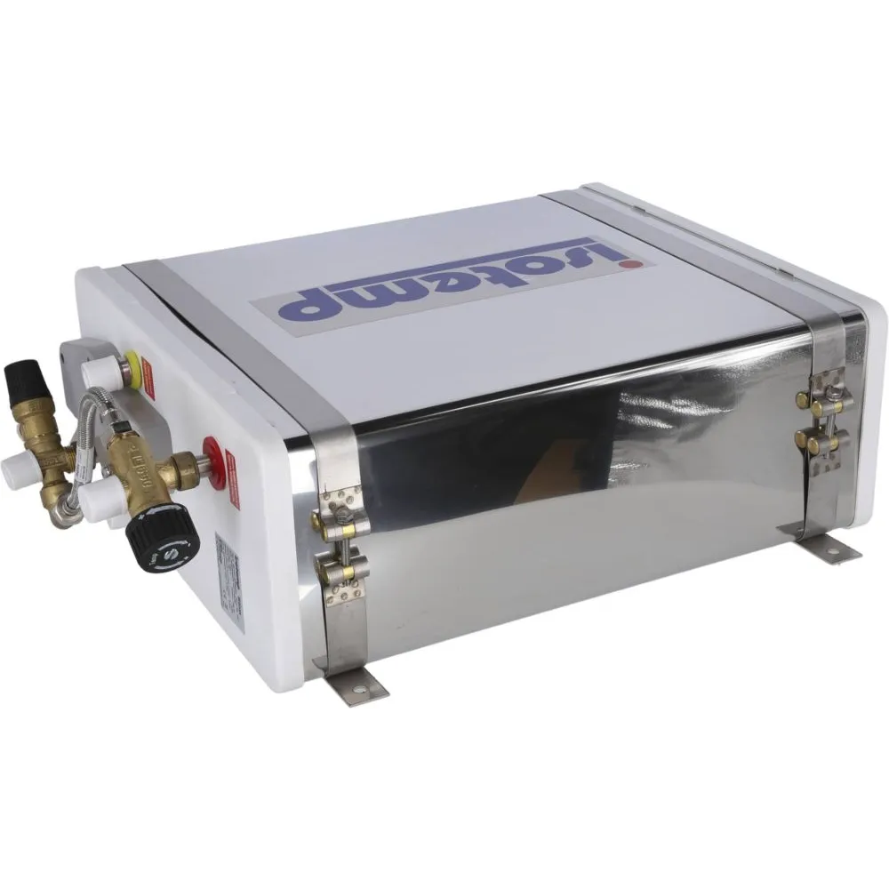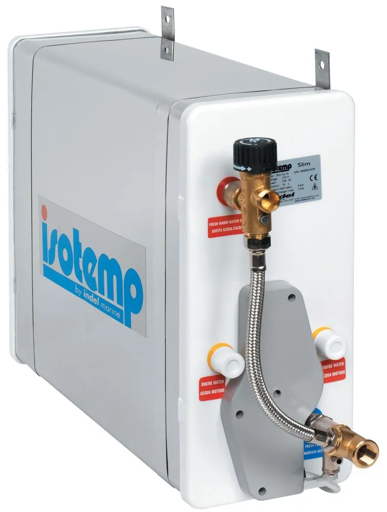 Installation horizontale ou verticale, mitigeur thermostatique et soupape de sécurité 7 bars de série. L’échangeur permet de connecter le chauffe-eau sur un circuit de chauffage à eau ‘’Hydronic’’ et/ou sur le circuit refroidissement du moteur.