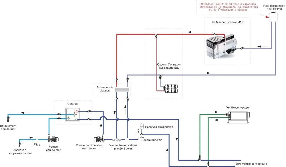 Une chaudière Hydronic MII avec support, pompe à eau intégrée, pompe GO déportée, tuyauterie GO (6m), tuyau d’aspiration air de combustion (0,5m), ligne d’échappement (2m) pré-montée avec silencieux, passecoque, faisceau électrique, kit fusibles, une commande marche-arrêt, divers accessoires (colliers, vis…)