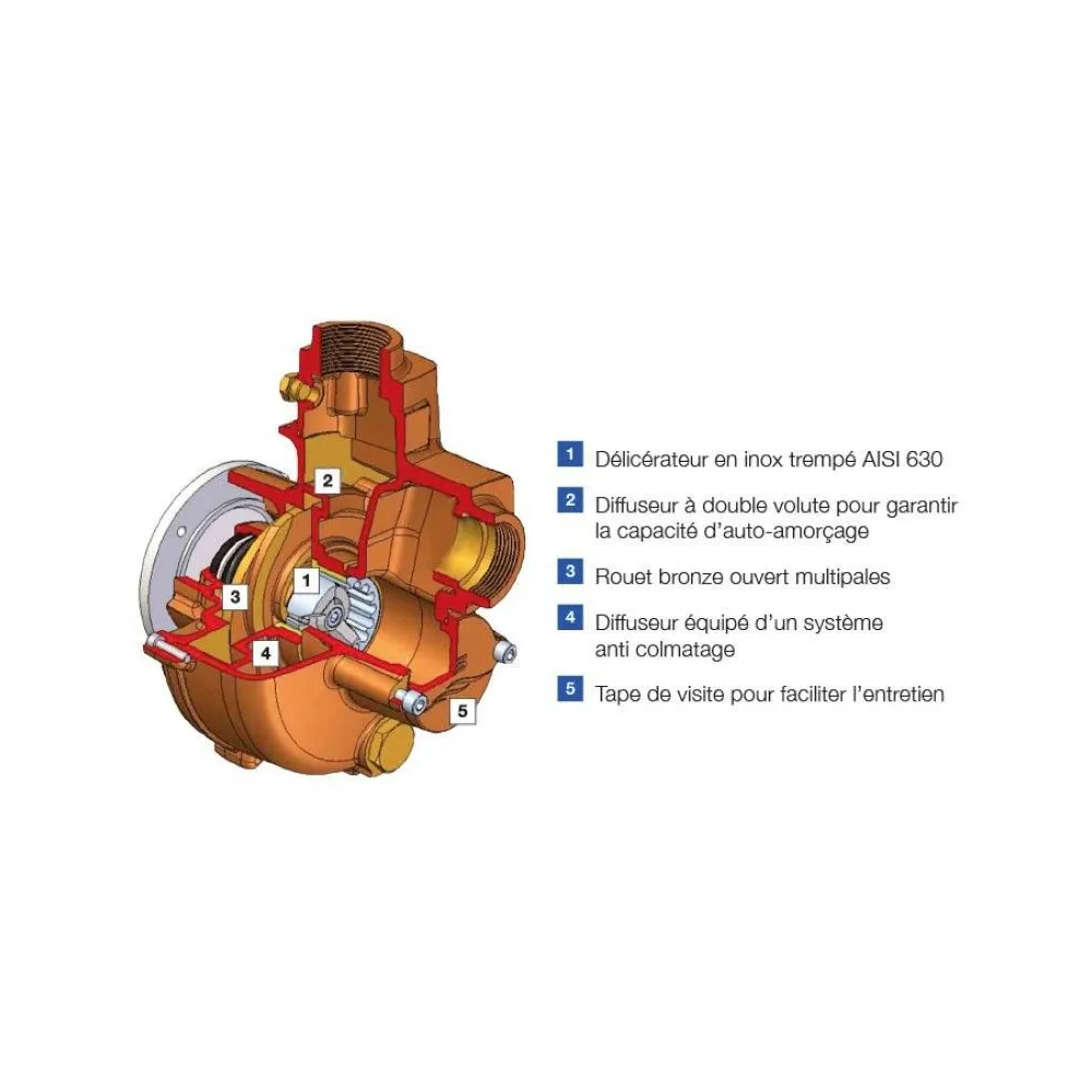 Fabriquée avec des matériaux de qualité, bronze et acier inoxydable AISI 630, la BMA-M est une pompe très robuste offrant une excellente résistance à l’usure et à la corrosion.