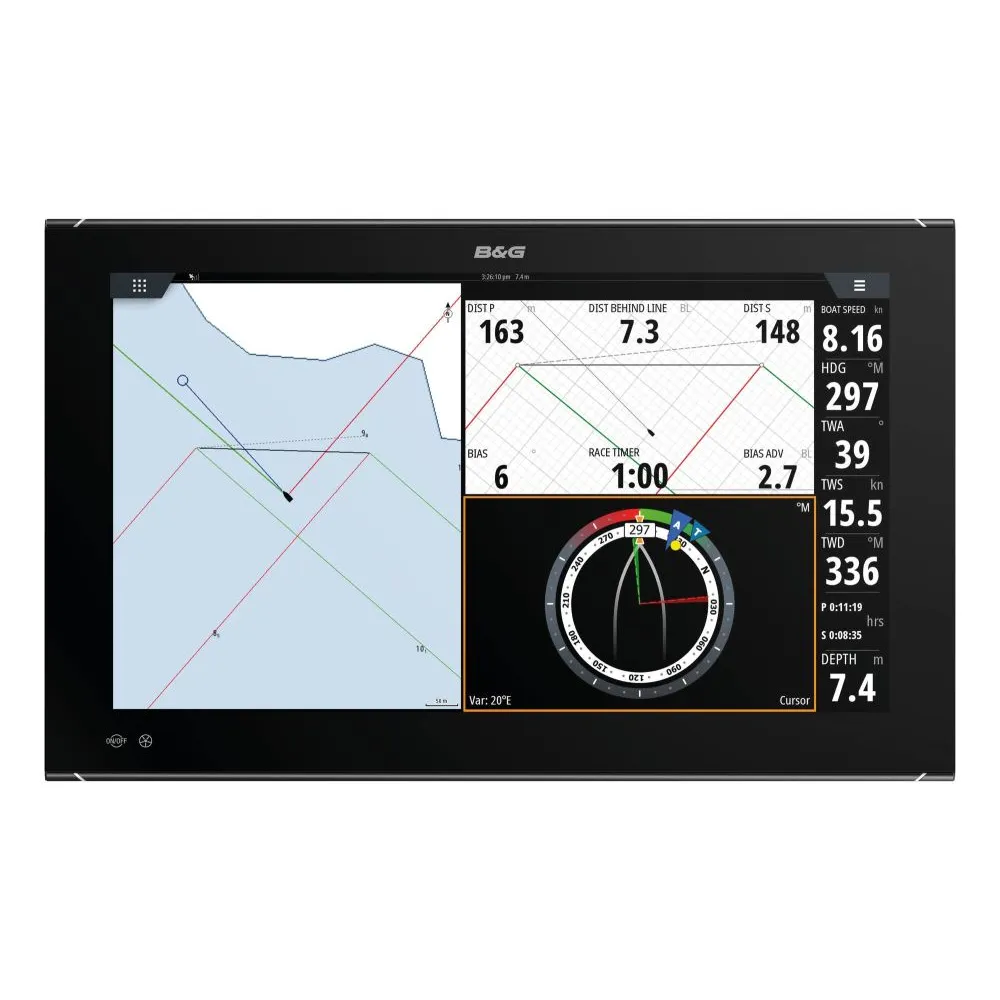- Connexion aux modules en réseau performants de B&G pour des performances exceptionnelles en mer : Radar Halo, pilote automatique, ForwardScan™, NMEA 2000 et 0183, commande pilote intégrée