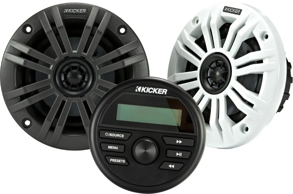 Un ensemble simple avec une source audio avec une petite façade à installer sur la console et une paire d'enceintes étanches.