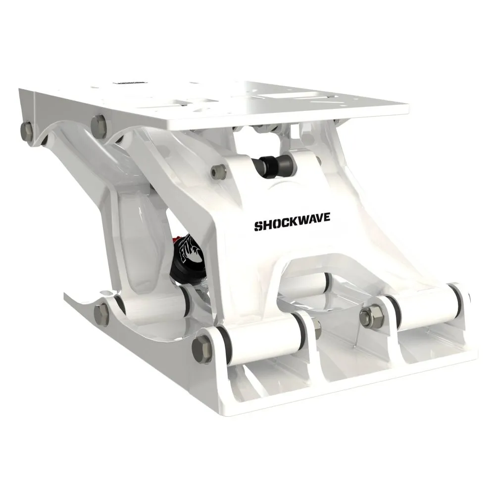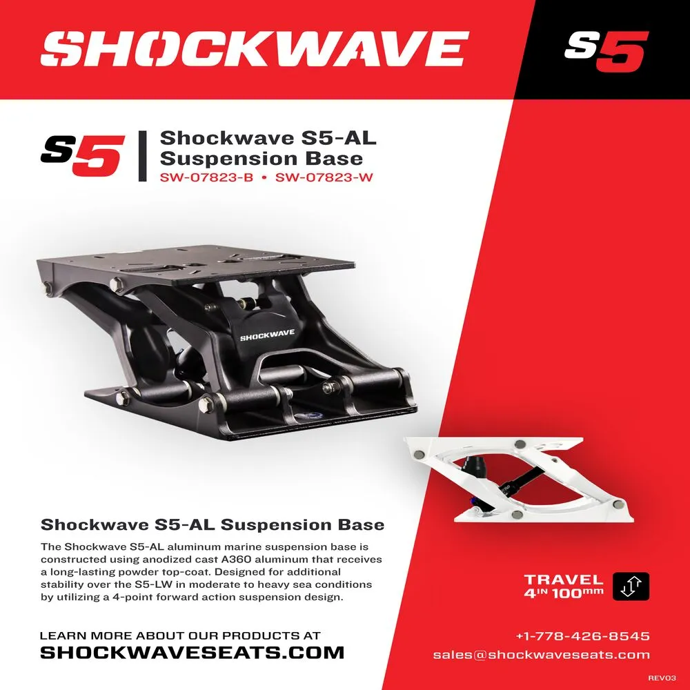 La base de suspension marine Shockwave S5-AL en aluminium est fabriquée en aluminium moulé anodisé A360, recouvert d'un revêtement en poudre durable. Conçue pour offrir une stabilité accrue par rapport à la S5-LW dans des conditions maritimes modérées à fortes, grâce à son design de suspension à action avant à 4 points.