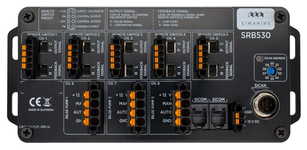 Distribution électrique avec 5 sorties 8A et 3 contrôles de pompes de cale 20A, avec protocoles SiCom et SiCAN, alimentation 12Vdc