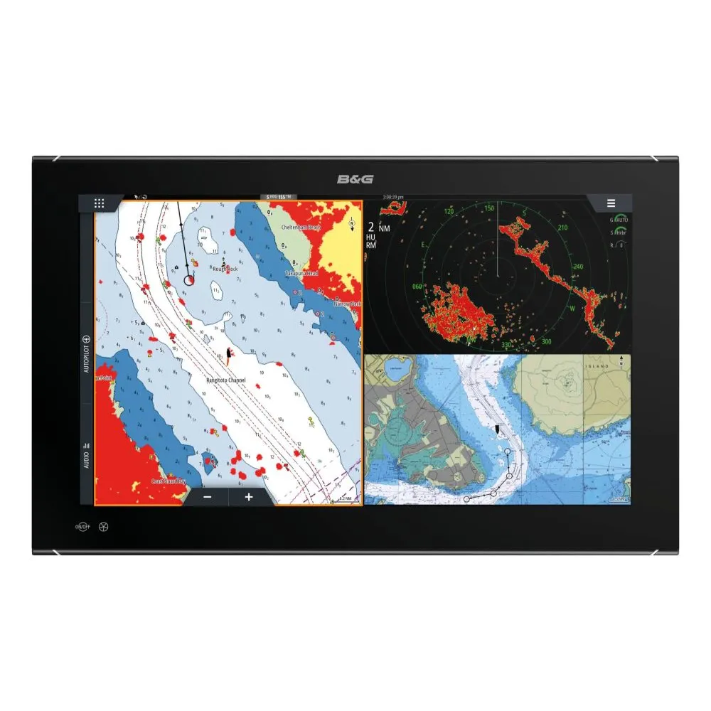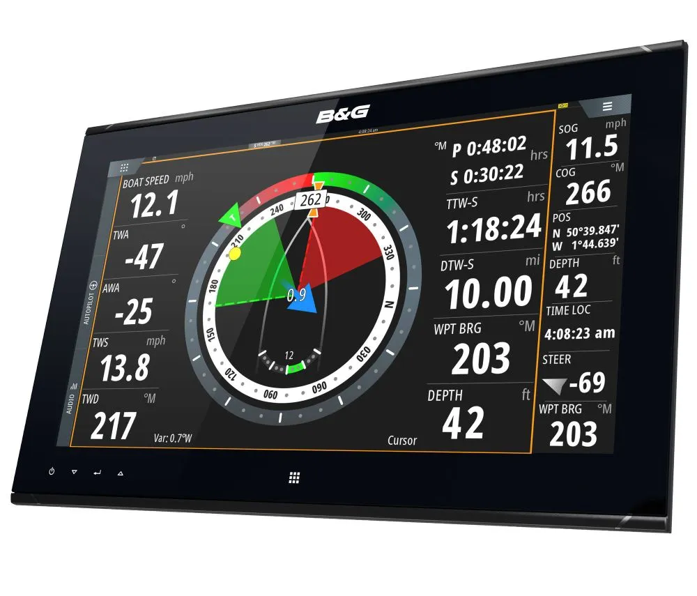 - Connexion aux modules en réseau performants de B&G pour des performances exceptionnelles en mer : Radar Halo, pilote automatique, ForwardScan™, NMEA 2000 et 0183, commande pilote intégrée